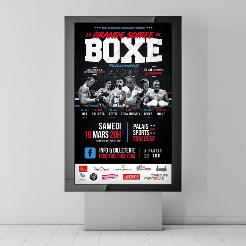 A l’occasion de cette soirée nos équipes ont donné toute leur force pour la mise en place de l’événement et la création de l’ensemble des visuel de la Boxe Toulouse.